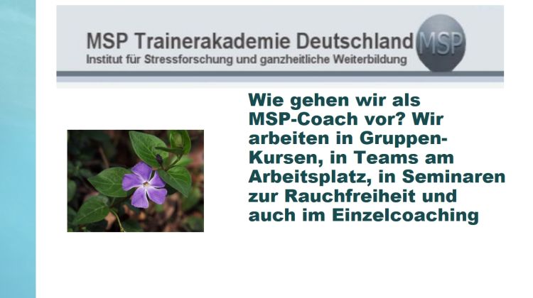 MSP Trainerakademie Deutschland staatlich anerkanntes Institut für Stress-Burnout-Forschung und ganzheitliche Weiterbildung (§ 10 AWBG). Träger nach dem Recht der Arbeitsförderung BRD mit Akkreditierungs-Zulassungsverordnung AZAV MSP Burnoutpsychologische Praxis zur ganzheitlichen, lösungsorientierten, körperorientierten Beratung und Behandlung von Burnout-Patienten